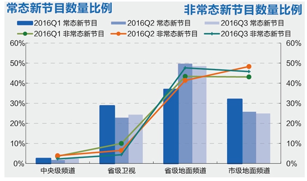 图2 2016年第一至三季度常态新节目与非常态新节目在各级频道的分布比例(%)