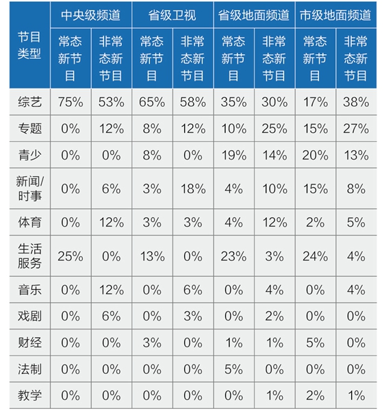 表1 2016年第三季度各级频道常态、非常态新节目的类型比例分布(%)