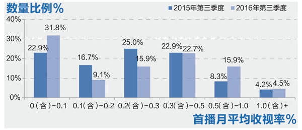 图5 2015、2016年第三季度地面频道常态新节目首播月平均收视率分布