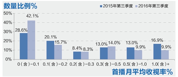 预期中的电视节目创新旺季在数量上表现平淡,在收视上却不乏亮点:上星频道常态新节目中,首播月71城市平均收视率在0.5%及以上的新节目数量占比为20.4%,较2015年同期的12.5%增长了近8个百分点(图4)。而地面频道的情况却不容乐观,第三季度地面频道本地首播月平均收视率在0.5%及以上的常态新节目数量占比明显减少,而收视率低于0.1%的节目数量占比则明显增长(图5)。