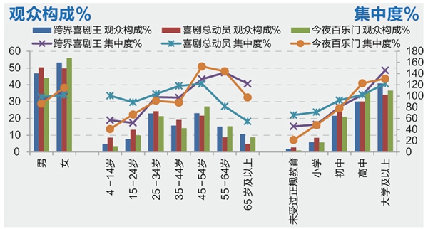 图7 2016年9月3档喜剧节目观众构成及集中度比较(71城市,18:00-24:00)