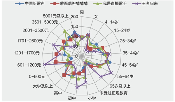 2016年第三季度,几档音乐真人秀很好地诠释了上述两个创新流向,并在目标受众定位中展现了差异化的突破方向。浙江卫视《中国新歌声》除了导师战车、声音之门的创新之外,节目仪式元素在继承中的创新也可圈可点;江苏卫视《蒙面唱将猜猜猜》以全面升级的赛制,在音乐悬疑竞猜方向上大步迈进;广东卫视《我是直播歌手》以卫视独播+社交平台+新媒体联动属性,开启新媒体时代联合造星模式;重庆卫视《王者归来》则聚焦昔日歌手,带大家重温经典,让当年偶像以一种全新的姿态回归大众视线。这些节目在"创新"和"回归"的不同诉求下,契合了不同年龄段受众的收视心理:创新主导的《中国新歌声》、《蒙面唱将猜猜猜》俘获更多年轻观众;《我是直播歌手》在中高收入群体中影响力不凡;向经典致敬的《王者归来》老年观众集中度明显更高(图8)。
