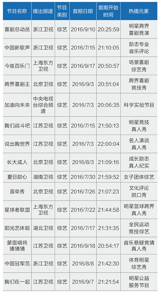 2016年第三季度,上星频道首播月平均收视率在0.4%及以上的常态新节目仍高度集中于综艺类(表3)。从节目的热播元素来看,原创喜剧节目通过重新集结文化、体育、音乐、演艺等领域的明星名人,在荧屏热播:浙江卫视《喜剧总动员》由影视明星组成喜剧战队,在吴秀波和郭德纲的带队下进行PK;北京卫视《跨界喜剧王》集结商界、文化界、体育界、音乐界等各领域的代表人物,在五位喜剧经纪人的协助下,展现属于不同领域的幽默风格表演。此外,上海东方卫视的《今夜百乐门》中金星、王祖蓝担当节目的主要嘴炮,携手神秘大嘉宾带来欢乐冲击波。