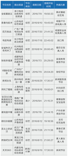 电视节目创新,作为传统电视谋求发展的主观性积极因素,已经成为各级电视媒体提升核心竞争力的重要举措。2016年第三季度,在暑期偕同奥运到来之际,电视节目创新市场也让观众倍感期待。暑期是否有新的大制作带来收视爆点?奥运节点中体育节目是否迎来放量增长?以往作为暑期收视重头戏的音乐节目是否有新的突破?本文以2016年第三季度71城市 市场中晚间播出的新节目 为分析对象,从播出、收视和创新特征等方面梳理分析,为大家逐一解开这些疑问。