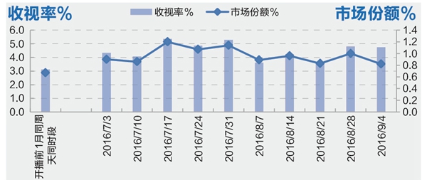 2016年第三季度,江苏卫视以生活中无处不需要的"说话"为出发点推出了一档价值观节目《说出我世界》,节目邀请各界精英、意见领袖和名人大腕来分享自己的人生故事。孙楠——《陪伴是献给未来最美的歌》、张亮——《做命运的掌舵者》、刘谦——《心中的奇迹》、周晓鸥——《我是一个小人物》、江疏影——《把一切归零,再从零开始》、Selina——《我一点都不"勇敢"》等用朴实的语言,通过自身的光环传达向上的正能量,成为一场为观众心灵给养的思想盛宴。可以看出,节目开播后,各期收视走势平稳,且较开播前1个月同周天同时段频道平均收视水平有一定的增长(图6),在弘扬主流价值的同时,也获得观众的认同。