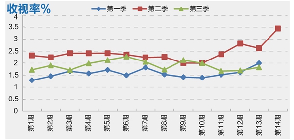 《笑傲江湖》是东方卫视在2014年推出的一档素人为主的喜剧类真人秀节目,迄今为止已成功推出了三季。区别于其他类型的素人竞技类喜剧类节目,《笑傲江湖》的表演类型更为丰富,包括小品、相声、模仿秀、口技、魔术、默剧,甚至于音乐和舞蹈,比如第二季中善于运用自己制作的纸片来模仿经典人物造型的"纸片男孩"逯爱岩,抓住模仿人物的特点精髓,再配合自己夸张幽默的表演,创作了《经典影视系列》、《经典动画系列》、《经典人物系列》、《致敬春晚系列》等叫好的喜剧作品;再比如第三季中用街舞演绎搞笑桥段的黄景行,这些都让观众了解到不少小众形式的喜剧类型。从第二季到第三季,在选手的构成上有了很大提升,第三季的《笑傲江湖》还出现了海外选手,比如来自日本的哑剧演员嘎玛鲁乔巴在台上大展机器人绝活,还有来自澳大利亚的喜剧人脐带兄弟表演了精彩的默剧,虽然这些选手来自海外,但并没有影响喜剧的表达,让节目选手和类型更加多元化。对比三季《笑傲江湖》的收视表现,第一季收视相对平稳,可谓打响了第一炮;第二季收视明显提升,也产生了很多佳作金句,捧红了一批深受大家喜爱的戏剧人,尤其是晋级赛和总决赛,收视率明显提升;第三季相较于前两季,很多大师级喜剧演员的加入的确为《笑傲江湖》增加了不少看点,也使节目品质得以飞升,但节目毕竟主打"素人喜剧选秀",含有比赛性质,素人选手与国内甚至国际大师同台竞技,似乎与素人的初衷有所背离,收视表现上虽不及第二季,但仍普遍高于第一季,处于相对较高的收视水平(图2)。