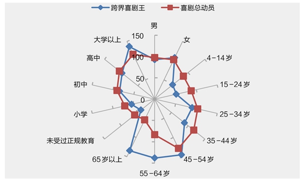 对比两档节目的观众喜爱程度来看,北京卫视《跨界喜剧王》受到中老年、高学历观众青睐;浙江卫视《喜剧总动员》则更被青少年观众、中高学历观众所喜爱。两档节目大致呈现出互补态势(图7)。