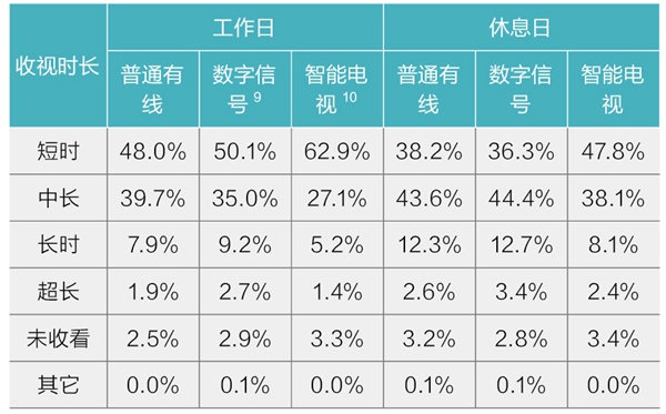 科技改变生活,不断发展的技术也在改变着电视信号的接入方式。普通有线接收方式,使天线接收时代的收到几个频道增加到了几十个频道;数字电视信号接入方式的出现,则给观众可收看到的频道数量带来了几何级的增长;智能电视的出现,让电视不再是单纯的收视设备,它赋予了电视更多的功能,实现了"人机互动"的共融体验。普通有线、数字信号和智能电视等不同信号接入方式,也带给电视机不同的使用功能。随着电视机功能的增加,那么是否会获得观众更多的关注,延长收视时间呢?显然从基础研究的调查结果来看,电视功能增加并未能延长观众收视时间。智能电视观众短时收视时间的观众比例,显著高于其他信号接入方式的比例,而智能电视其余收视时间的比例则普遍低于其他观众,工作日较休息日更为明显。工作日,数字信号观众长时和超长收视时间的比例超过普通有线。休息日,数字信号短时收视观众比例低于普通有线,而其余收视时长则均高于普通有线。可见,在电视仅作为收视设备的情况下,可收看到的频道数量越多,越能提升观众长时间收视的兴趣。当电视不仅作为收视设备,有了其它功能用作它途时,反而使观众的收视时间减少(表2)。