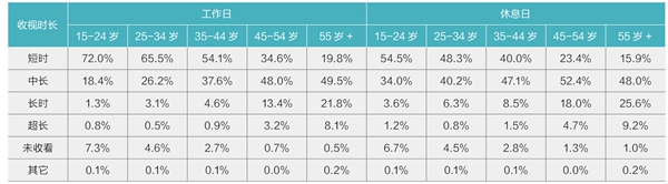 表3 不同年龄观众受访前一周不同收视时长比例
