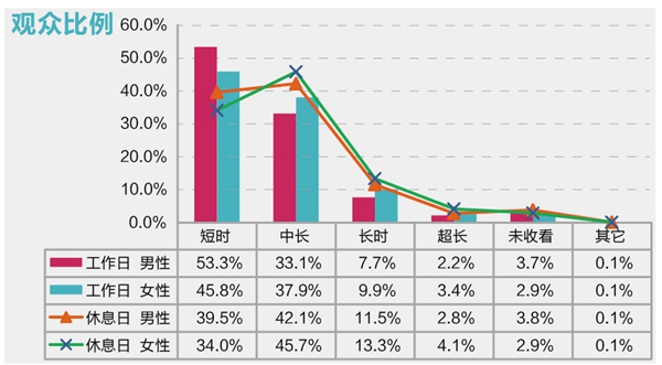 1、 男性观众偏向短时收视,长时间的收视女性更具优势