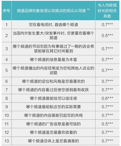 2015年12城基础研究针对电视频道在观众心目中的品牌形象进行了相关的调查,针对13个认知观点,请受访观众分别选出自己认为最符合的频道,从而获得了每个观点 观众对于不同频道的认同度。再计算观众的人均收视时长与每个观点的观众频道认同度的相关系数并进行显著性检验(在0.01水平,进行双侧检验,每个观点检验结果均是p=0.000<0.01,具有统计学意义)。各项观点的观众认同度与观众收视消费(人均收视时长)的相关系数在0.5-0.7间分布,由此可知二者间存在中等程度 的正相关,即观众认同度提升可能会对观众收视消费增加产生影响。