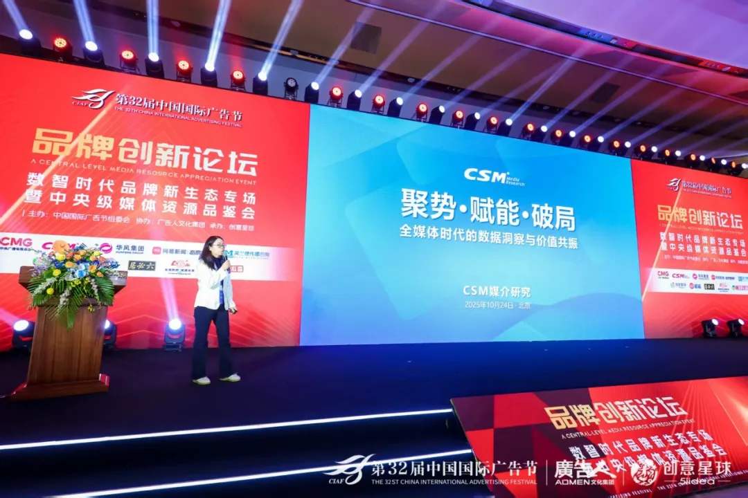 2025年10月24日,由中国国际广告节组委会主办,广告人文化集团协办,创意星球承办,中央广播电视总台总经理室作为特别支持单位,中国广视索福瑞媒介研究(CSM)等多家单位联合主办的第32届中国国际广告节·2025品牌创新论坛——数智时代的品牌新生态专场暨中央级媒体资源品鉴会,在北京中关村国际创新中心隆重开幕。中国广视索福瑞媒介研究有限责任公司(CSM)应邀出席会议,CSM副总经理肖建兵 和CSM大客户事业部副总经理周晓芳 分别从不同维度为行业呈现全媒体时代的传媒发展态势与数据洞察