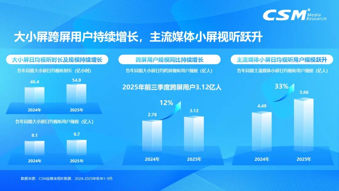 媒介发展当下已进入主流价值引领、大屏与小屏共同发展的新常态。数据显示,2025年前三季度大小屏日均视听时长及规模相比2024年同期均在增长,大小屏跨屏用户规模已达3.12亿,同比增长12%;主流媒体持续推动大小屏深度融合,其小屏日均视听用户规模较2024年同期提升33%。