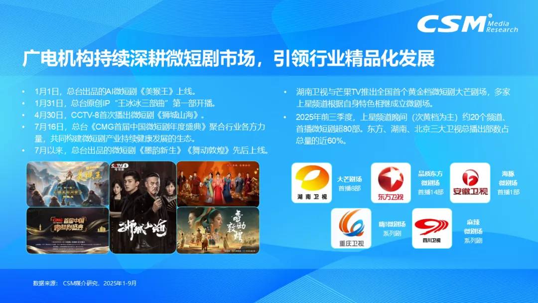 电视剧市场百花齐放,央卫视首轮新剧82部,现实题材以超六成占比主导市场,古装剧也不乏现象级爆款。2025年中央广播电视总台大剧承包大屏剧集收视率前十,《六姊妹》创近十年CCTV-1黄金档纪录,《藏海传》登顶CCTV-8近五年古装剧榜首。广电机构持续深耕微短剧市场,引领行业精品化发展。