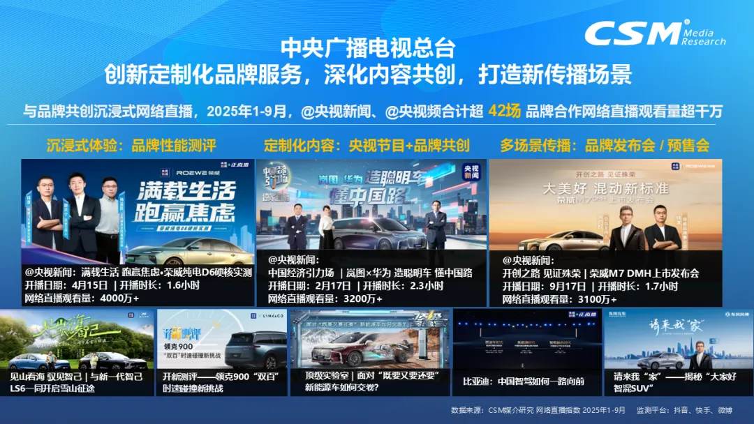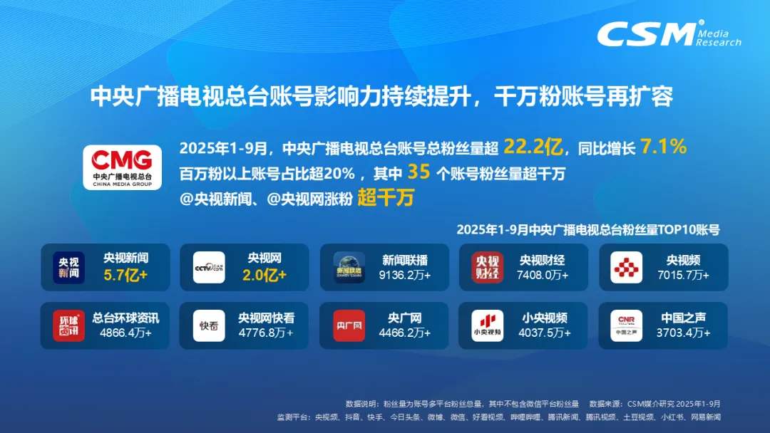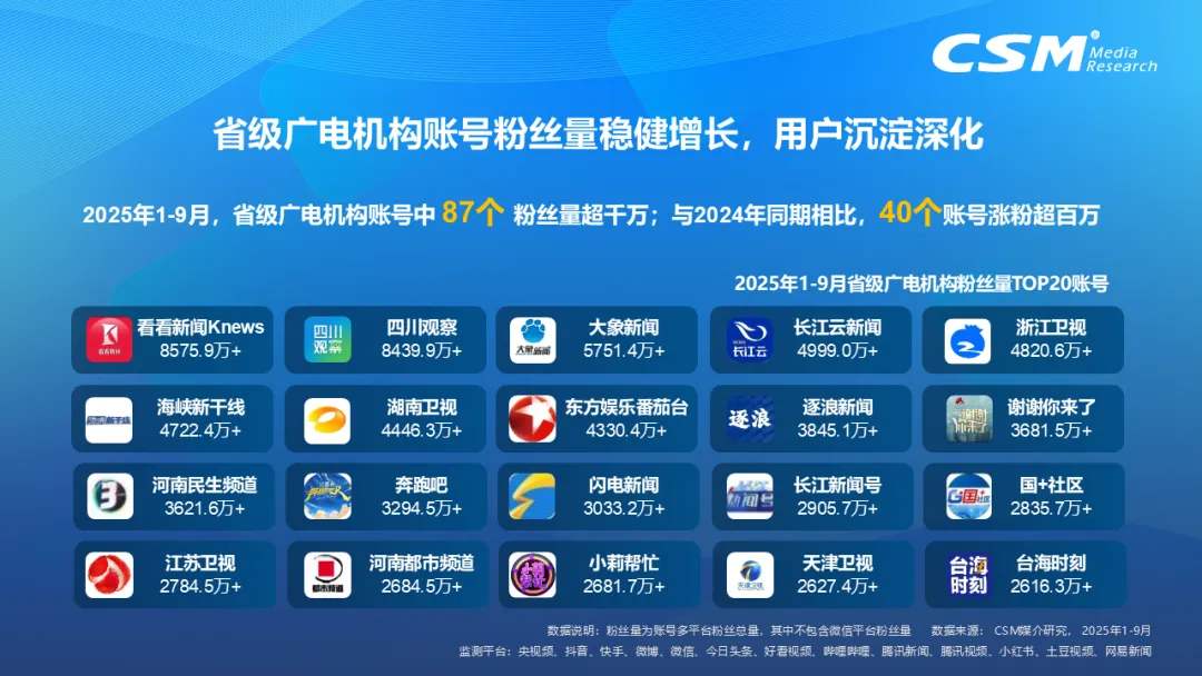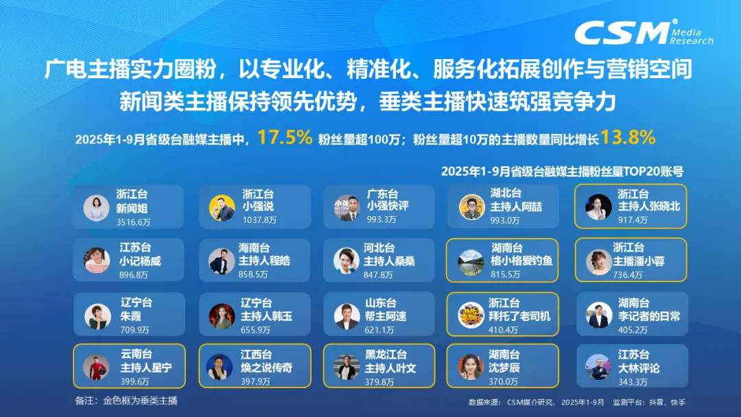主流媒体以信任感、正能量为基石,构筑高品质传播与新媒体旗舰平台,在媒体融合进程中影响力不断扩大。2024年网民调查数据显示,用户对中央级媒体信任比例达92.9%,超出短视频客户端、社区/论坛等渠道40个百分点。2025年前三季度,中央广播电视总台账号总粉丝量超22.2亿,同比增长7.1%,35个账号粉丝数超千万;@央视新闻、@央视频在抖音、微博等平台开展的品牌合作直播中,超42场观看量过千万,涵盖汽车性能实测、节目内容定制及主持人参与品牌发布等多种形式。省级广电机构账号粉丝量稳健增长,2025年前三季度87个账号粉丝量超千万。17.5%的省级台融媒主播粉丝量超100万,粉丝量超10万的主播数量同比增长13.8%,新闻类主播保持领先优势。