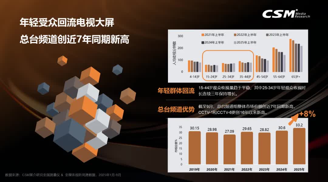 从电视大屏角度看,2025年1-9月全国电视观众累计达12亿,月活用户9.8亿,观众日均收视时长228分钟,电视仍是非常主流的媒体。年轻受众回流电视大屏的迹象也非常明显,15到44岁的观众收视量趋于平稳,其中25岁到34岁连续3年保持温和增长。同时,过去几年中总台所有频道收视份额屡创新高,今年比去年同期增长8%,其中CCTV1和CCTV6更创16年来的新高。