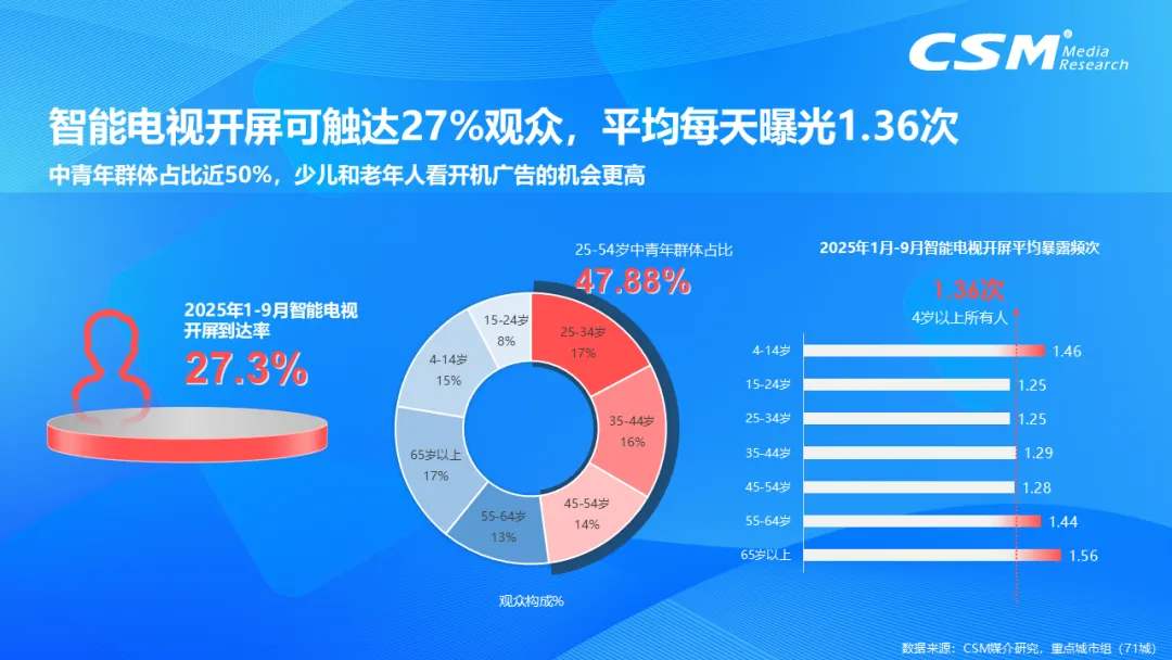 随着多类型机顶盒和互联网电视的普及,电视观众的收看场景也越来越丰富。2025年前三季度,IPTV与OTT互动平台收视份额近20%,其观众以儿童及青年观众为主,年轻观众的收视偏好正逐步改变着大屏的收视格局。作为重要的内容展示渠道,智能电视开屏可触达27%观众,其中中青年群体占比近50%,其经营价值仍待进一步提升。