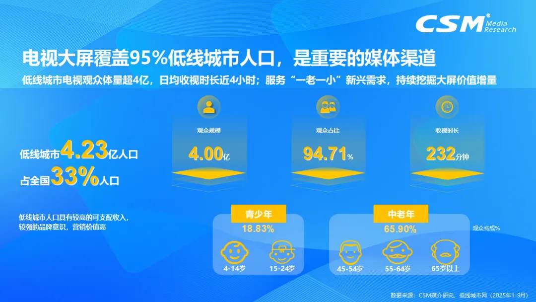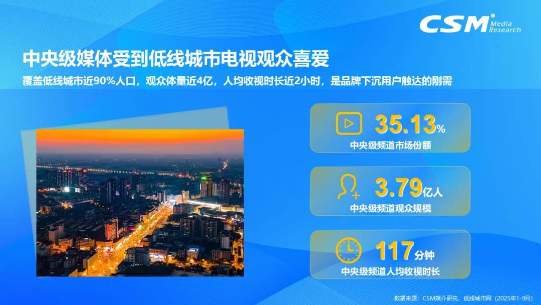 在媒体渠道多元化的环境下,电视大屏仍保持95%的人口覆盖,是低线城市重要的媒体渠道。2025年前三季度,电视媒体以其优势的观众覆盖和高收视粘性,持续提升电视大屏在各级市场的影响力。中央级媒体也在不断以创新的营销方式,持续挖掘电视媒体商业潜力,为品牌铸造“信任盾牌”。
