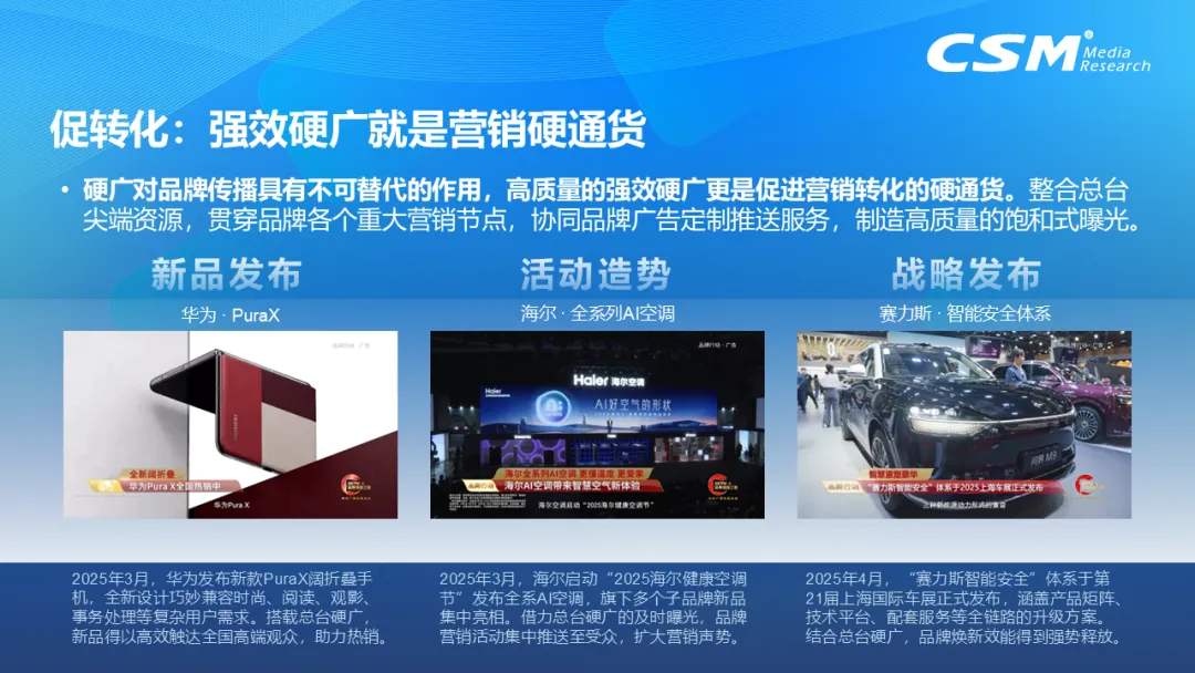 2025年,主流媒体整合多渠道资源,创新营销模式,进一步拓宽硬广和软广的合作维度,为品牌的社会价值与市场价值协同提升赋能。硬广是声量引爆器,2025年上半年,鲁花、茅台、伊利通过在中央广播电视总台投放硬广,实现全媒体累计触达均超300亿人次,品牌达成全民级深度覆盖;华为、海尔、赛力斯等品牌也通过硬广投放扩大新品的营销声量。软广则是心智播种机,泸州老窖、中国农业银行等品牌与中央广播电视总台大IP开展软广定制,将优质IP的文化特性与品牌价值捆绑,高效提升消费者的品牌认同。