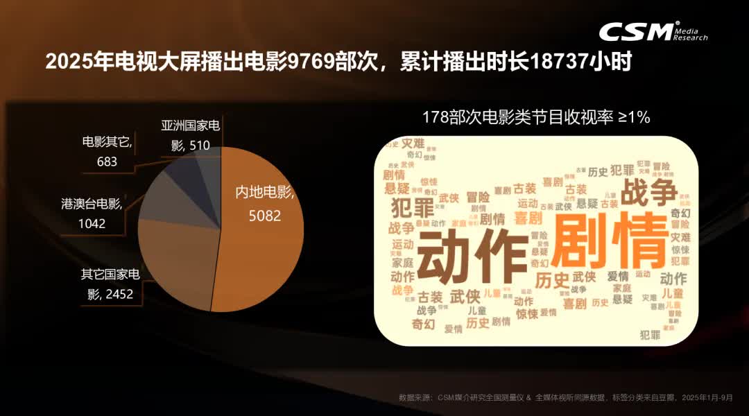 在电视大屏端,电影类节目同样呈现高增长态势:2025年1-9月全国电影类节目播出量达9769部次,覆盖观众规模9.1亿,观众日均收看电影类节目时长49分钟,较去年增长40%;从影片来源看,国产电影占比超50%,港澳台电影占比10%以上,欧美等其他国家电影占比约25%。