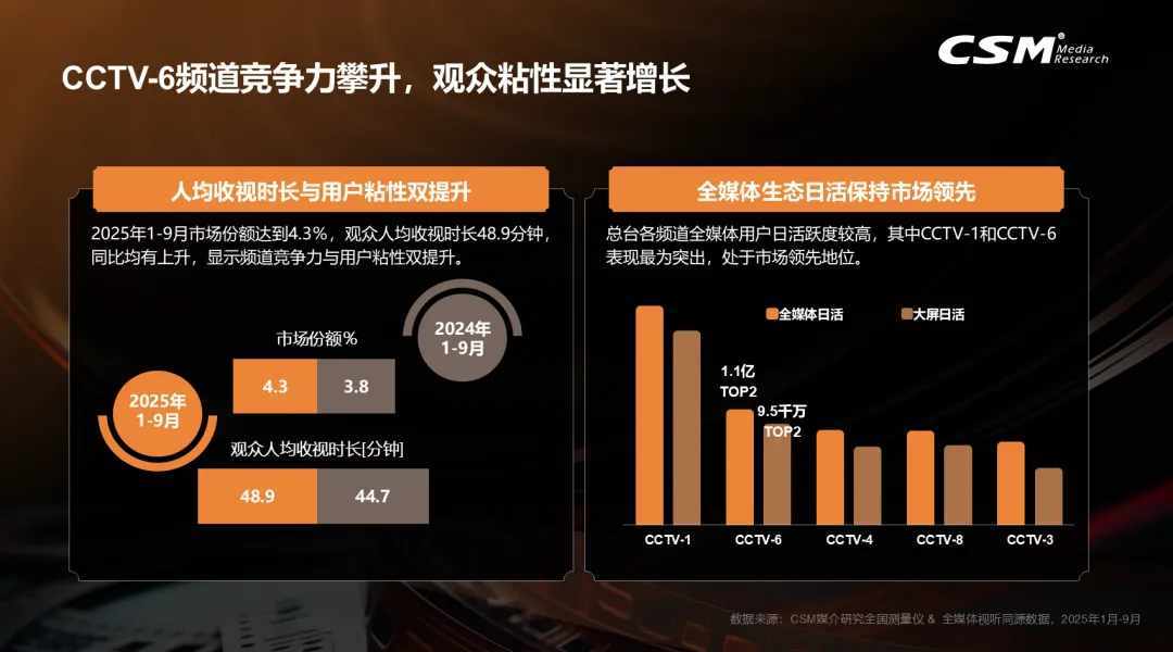 今年1-9月,CCTV6市场份额达4.3%,较去年同期的3.8%实现明显增长,观众人均收视时长也从44分钟提升至48分钟,用户粘性进一步增强。