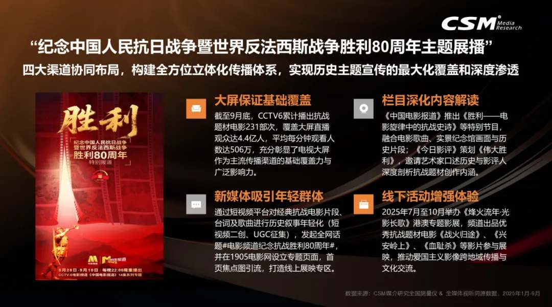 在纪念中国人民抗日战争纪念世界反法西斯战争胜利80周年的主题展播当中,电影频道四大渠道协同,实现了很好的宣传效果。大屏保证基础覆盖、栏目深化内容解读、新媒体吸引年轻观众、多种活动增强宣传体验,构建了一个具有电影频道特色的全方位立体化的传播体系。