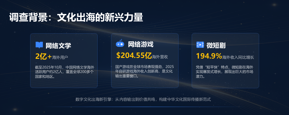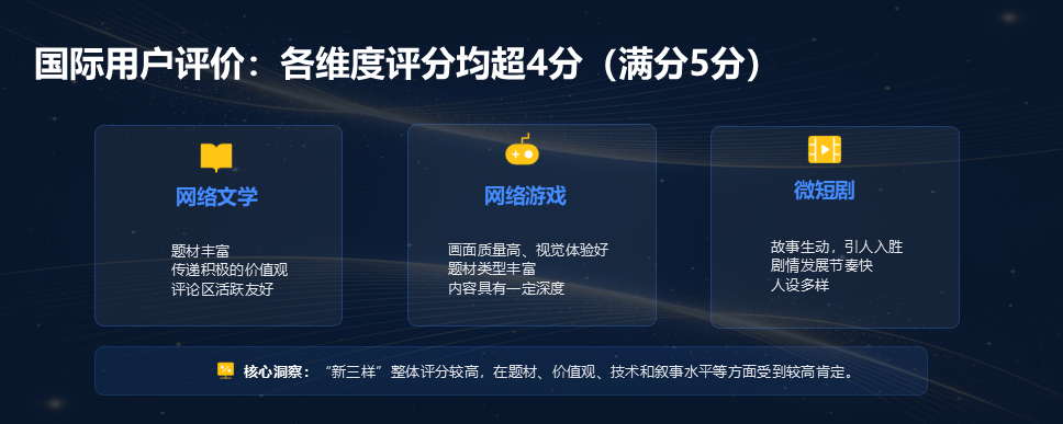 调查显示,“新三样”对增进中国文化理解效果显著:超七成网游用户、超六成网文用户及超四成微短剧用户表示,通过这些作品加深了对中国的认知与好感。“新三样”以沉浸式体验打破文化隔阂,推动从内容输出走向价值共鸣,构建中华文化国际传播新范式。